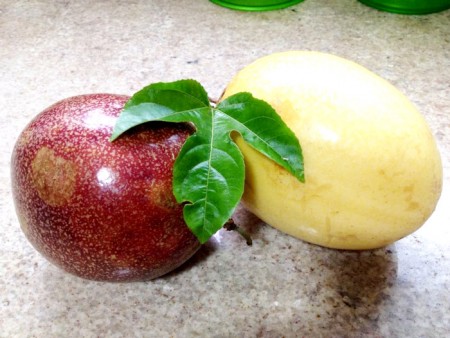 Esse é o maracujá que usamos no suco. Sua flor, Passiflora, é conhecida como flor da paixão por sua beleza. Há mais de 200 espécies